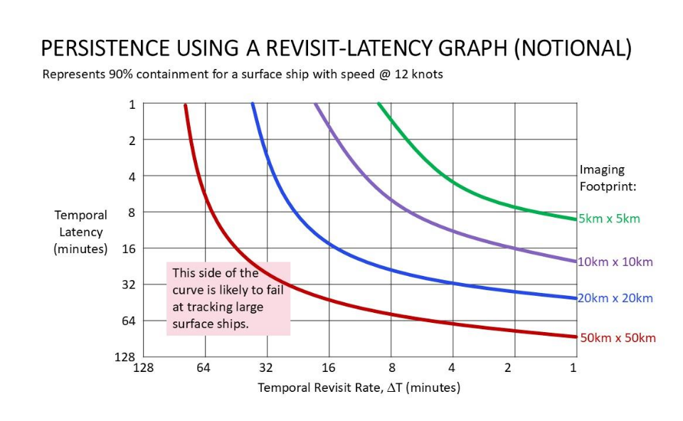 To appropriately understand what achieving persistence means, it is necessary to model outcomes using realistic mission scenarios. Persistence is best defined as sufficient ISR collection to capture the rate of information change needed for a mission use case. In the case of maritime domain awareness, observing all ships at least once every 15 minutes has been deemed sufficient for tracking ships and observing patterns of activity. Ships don’t move all that fast and because of physics they tend to have predictable trajectories. In a separate mission use case, monitoring a specific ground vehicle as it navigates an urban landscape may require observations every few seconds from vantage points not obscured by the terrain (i.e. tall buildings). This is a far more stressful scenario for achieving persistence.