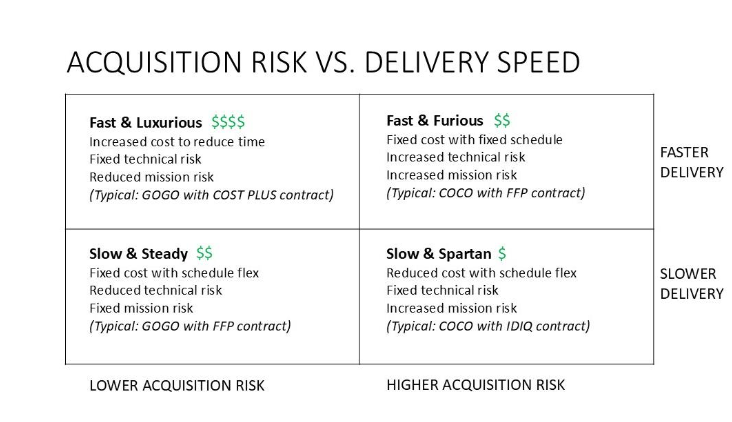 Time vs. Risk Spectrum. Tactical military commanders naturally understand the time vs. risk spectrum in their activities. This same decision-making calculus now needs to be instilled in the space acquisition professional. Accepting acquisition risks to generate the potential for better mission outcomes must be rewarded instead of disincentivized. Too often an acquisition professional is rewarded for simply spending their budget on a program that fails to deliver capabilities. This unfortunate mismatch in the acquisition professional incentive structure disregards the opportunity cost of NOT choosing a commercial solution because this analysis is completely opaque to the system. That opportunity cost may include increased costs, delayed schedules, and less mission capability. The graphic below highlights differences in delivery speed versus acquisition risk and identifies a typical acquisition strategy in each category. Most U.S. space acquisition programs fall on the left side of this diagram while notably the Space Development Agency (SDA) opted for “Fast & Furious” acquisitions to break the cycle.